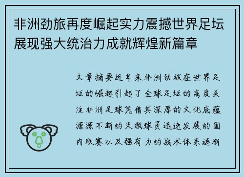 非洲劲旅再度崛起实力震撼世界足坛展现强大统治力成就辉煌新篇章