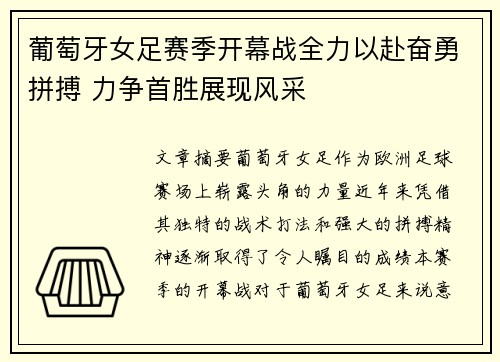 葡萄牙女足作为欧洲足球赛场上崭露头角的力量,近年来凭借其独特的战术打法和强大的拼搏精神逐渐取得了令人瞩目的成绩。本赛季的开幕战对于葡萄牙女足来说意义非凡,球队全力以赴、奋勇拼搏,力争首胜并展现其风采。本文将从四个方面详细阐述葡萄牙女足在赛季开幕战中所展现的努力与决心。首先,通过球队的精神面貌与目标设定,分析她们如何在赛季开端树立胜利信心;其次,探讨教练战术布置与球员的执行力之间的紧密配合,如何为球队的胜利打下坚实基础;第三部分将聚焦球队核心球员的表现,分析她们如何在比赛中担当关键角色,成为胜利的关键因素;最后,本文将通过赛事后的总结与展望,讨论葡萄牙女足未来的发展潜力以及如何持续在国际赛场上争取佳绩。葡萄牙女足全力以赴的拼搏精神,不仅是她们赛季开幕战的动力,也为未来的挑战注入了无限的动力。