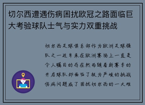 切尔西遭遇伤病困扰欧冠之路面临巨大考验球队士气与实力双重挑战