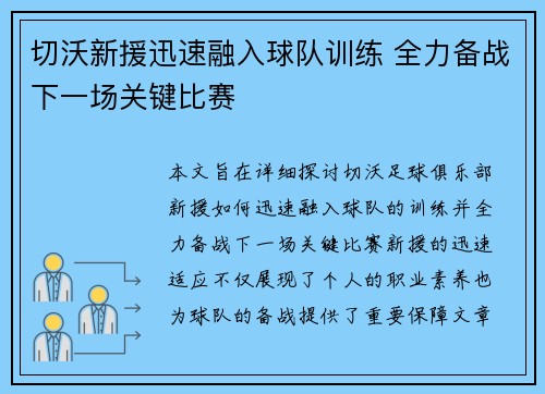 本文旨在详细探讨切沃足球俱乐部新援如何迅速融入球队的训练,并全力备战下一场关键比赛。新援的迅速适应,不仅展现了个人的职业素养,也为球队的备战提供了重要保障。文章从四个方面进行阐述,分别是新援的适应能力、与队友的配合、在训练中的表现以及在即将到来的比赛中发挥的关键作用。每一部分都通过多个自然段展开,详...